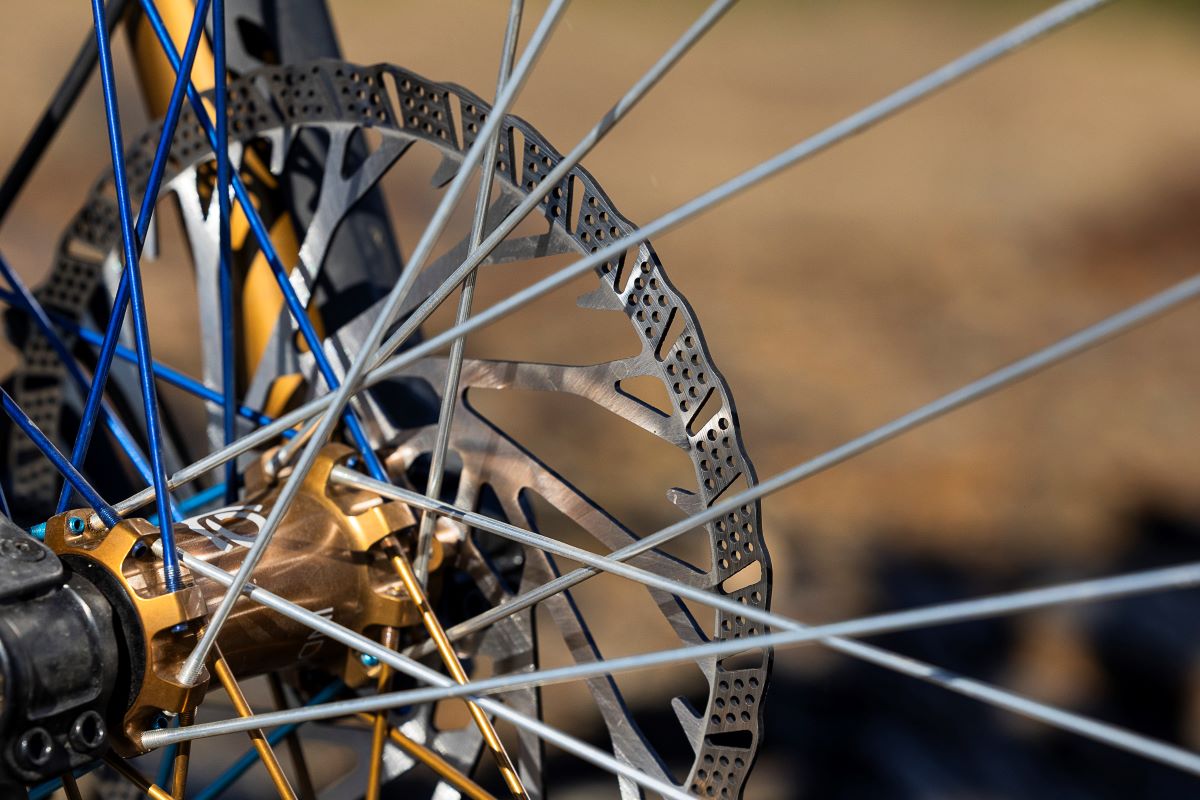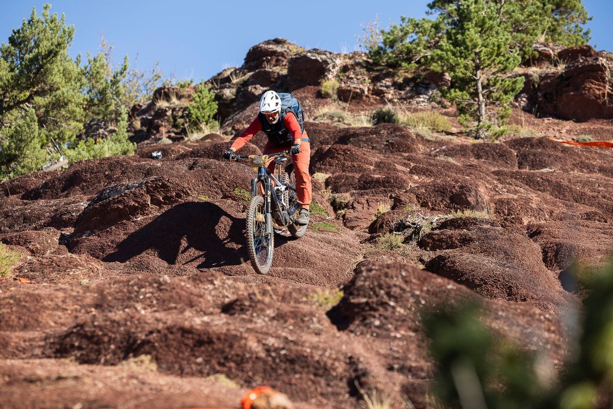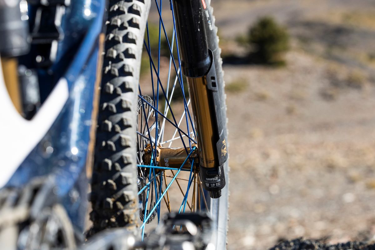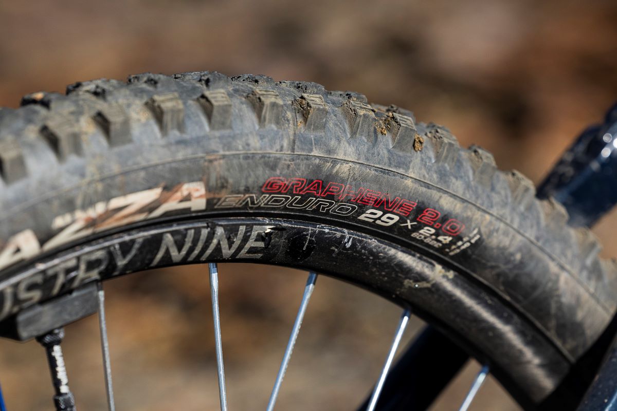 - Delantero: el nuevo Vittoria Mostro en medida 2.6 y compuesto Enduro Race. Un neumático que ha sorprendido por su increíble apoyo en frenada y su seguridad en terreno suelto. Su diseño de taqueado lateral proporciona un agarre excepcional sin ser excesivamente cuadrado.