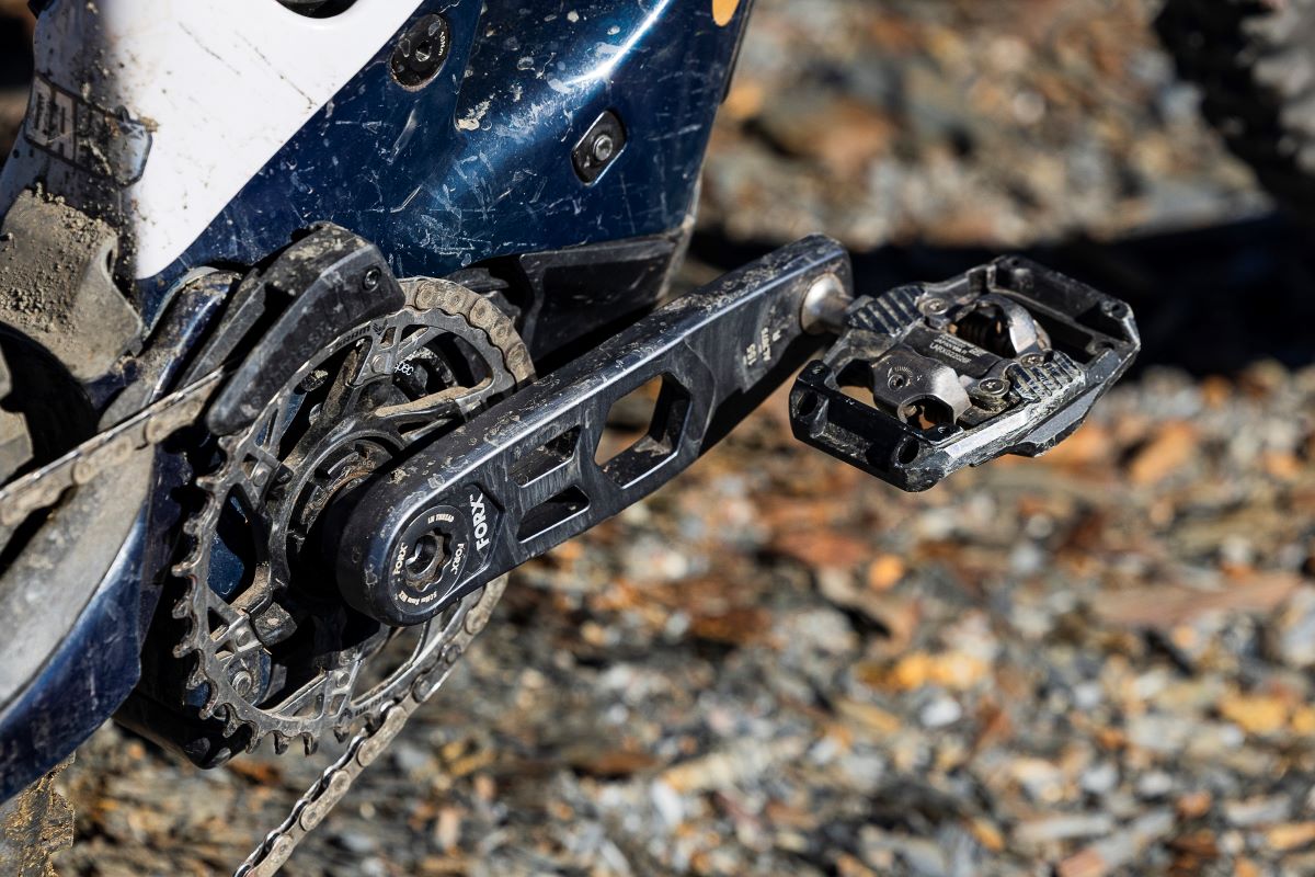 En un montaje de este nivel, los pequeños detalles cuentan. Se han montado unas bielas Forx de 155 mm, más cortas que las de serie, para aumentar la altura libre al suelo y evitar golpes con los obstáculos. Además, se han añadido los nuevos pedales Shimano XTR, que a pesar de su aspecto desgastado, fueron estrenados en la carrera.